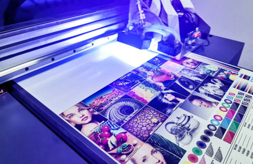 UV Printing consists of using UV (Ultra Violet) light to 'cure' or dry specially formulated inks. As ink is dried instantly after printing it enables printing at a much higher quality than previously was possible due to ink droplets not being able to spread